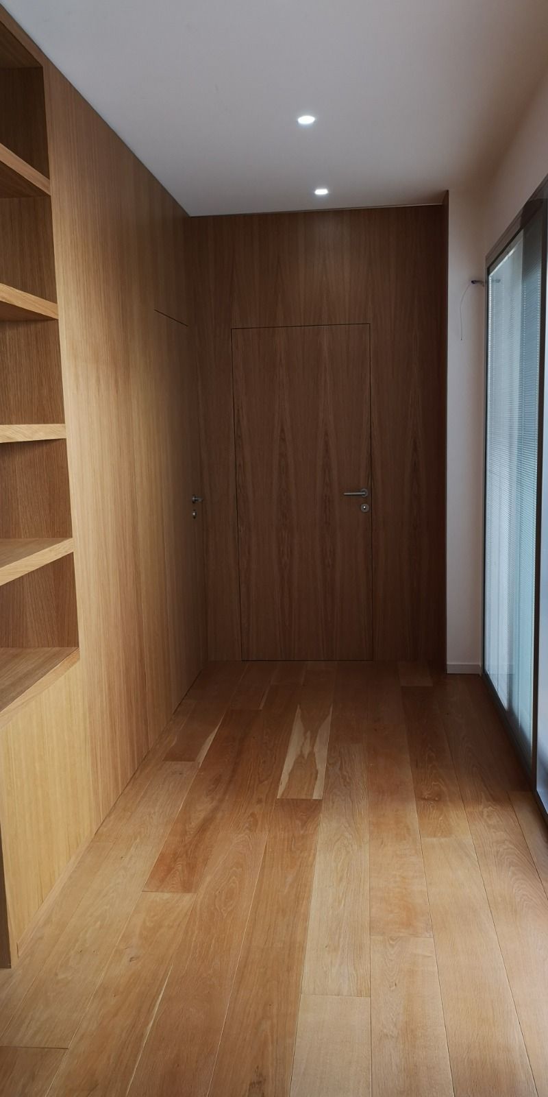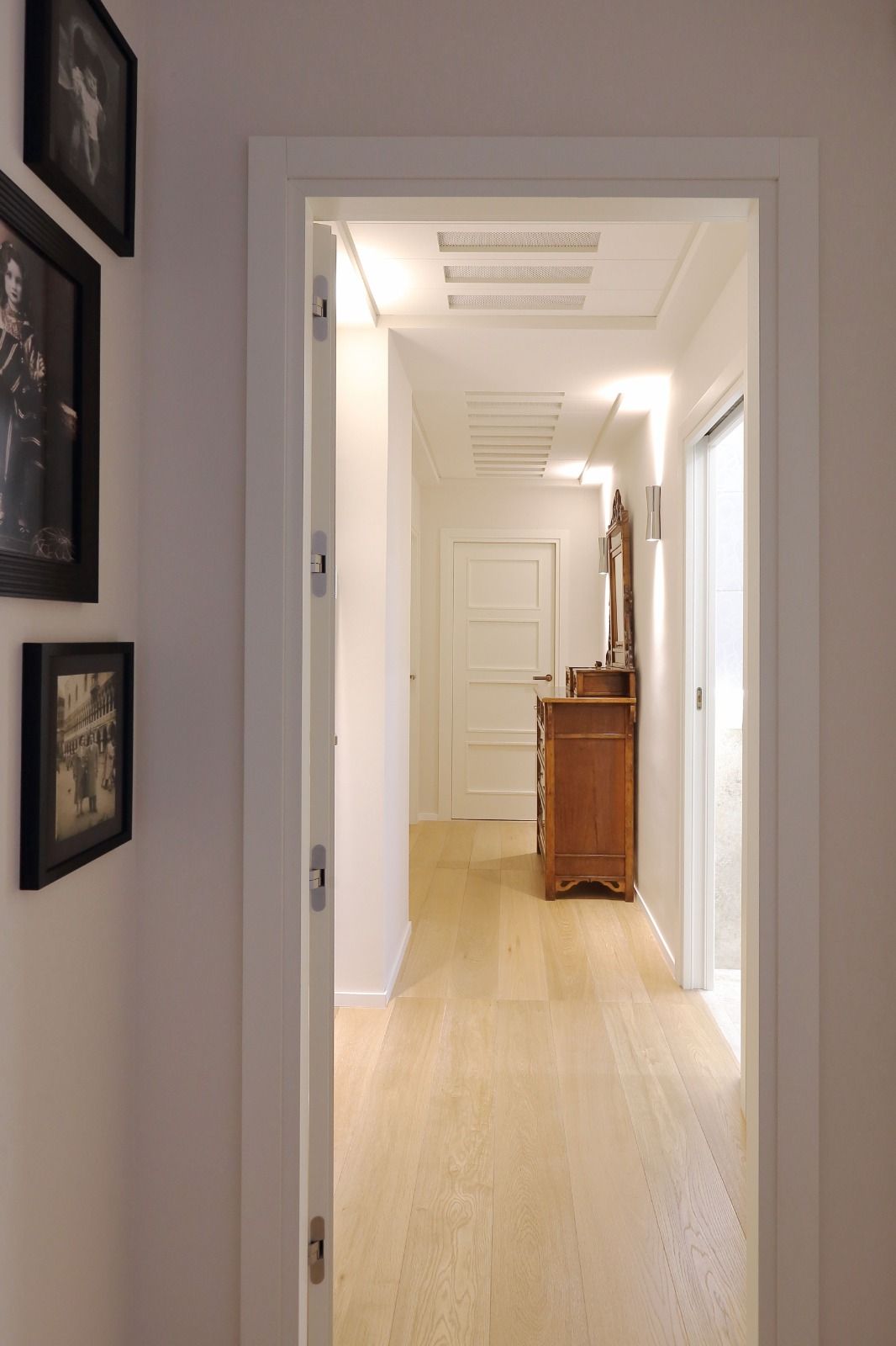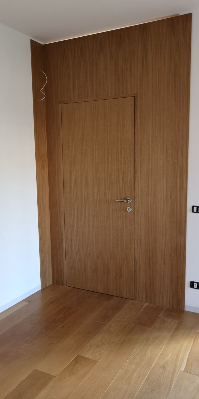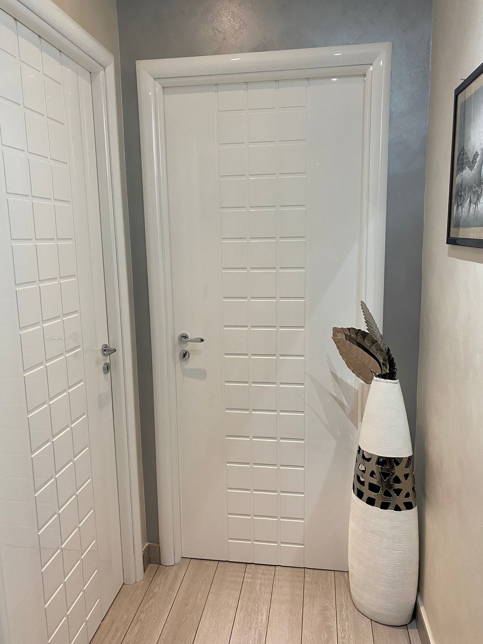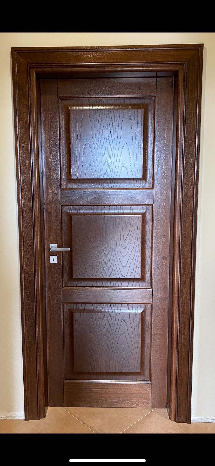 - porte in legno massello con finitura moderna e maniglie in acciaio spazzolato;