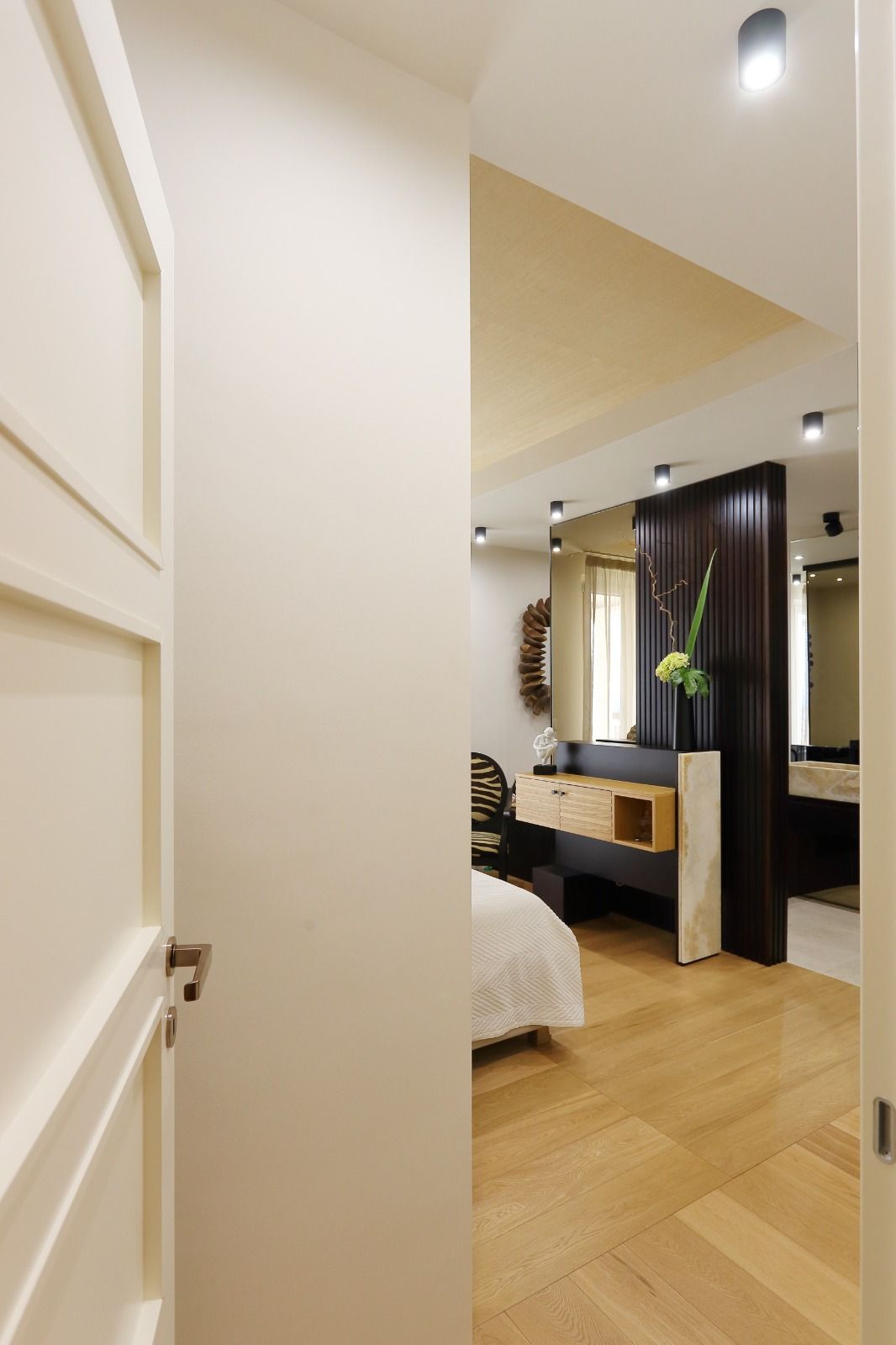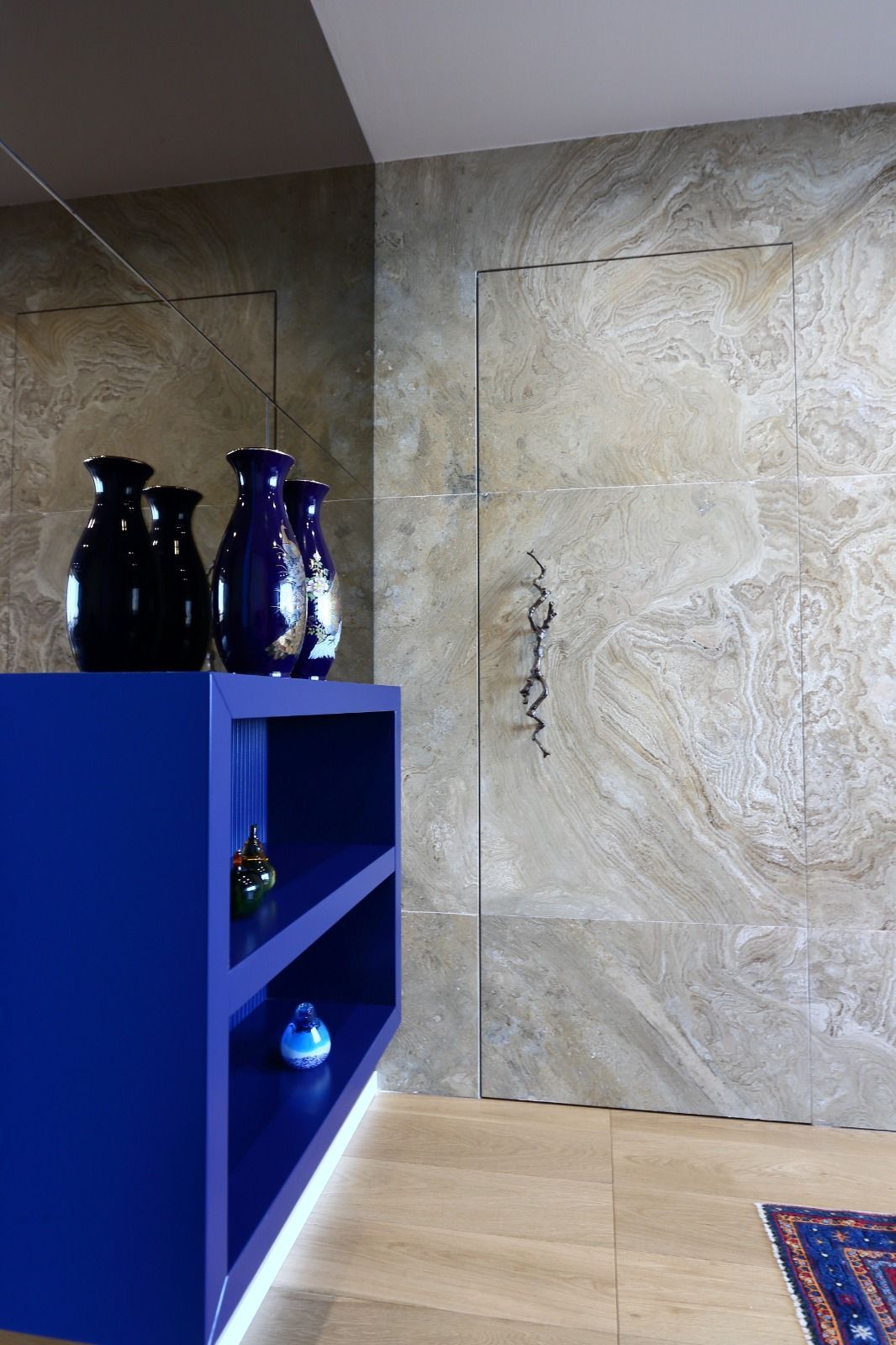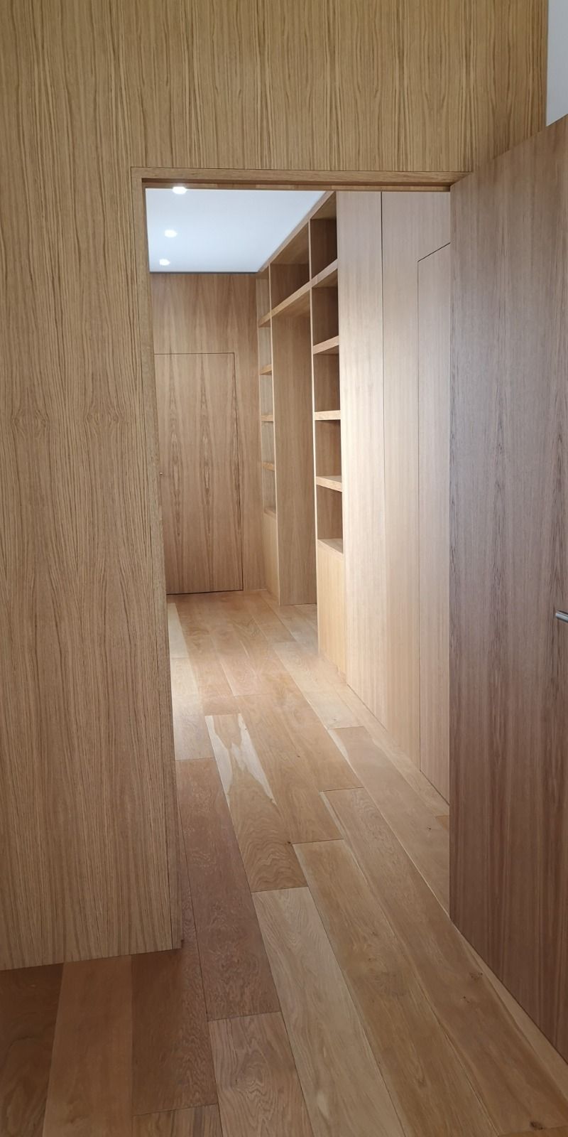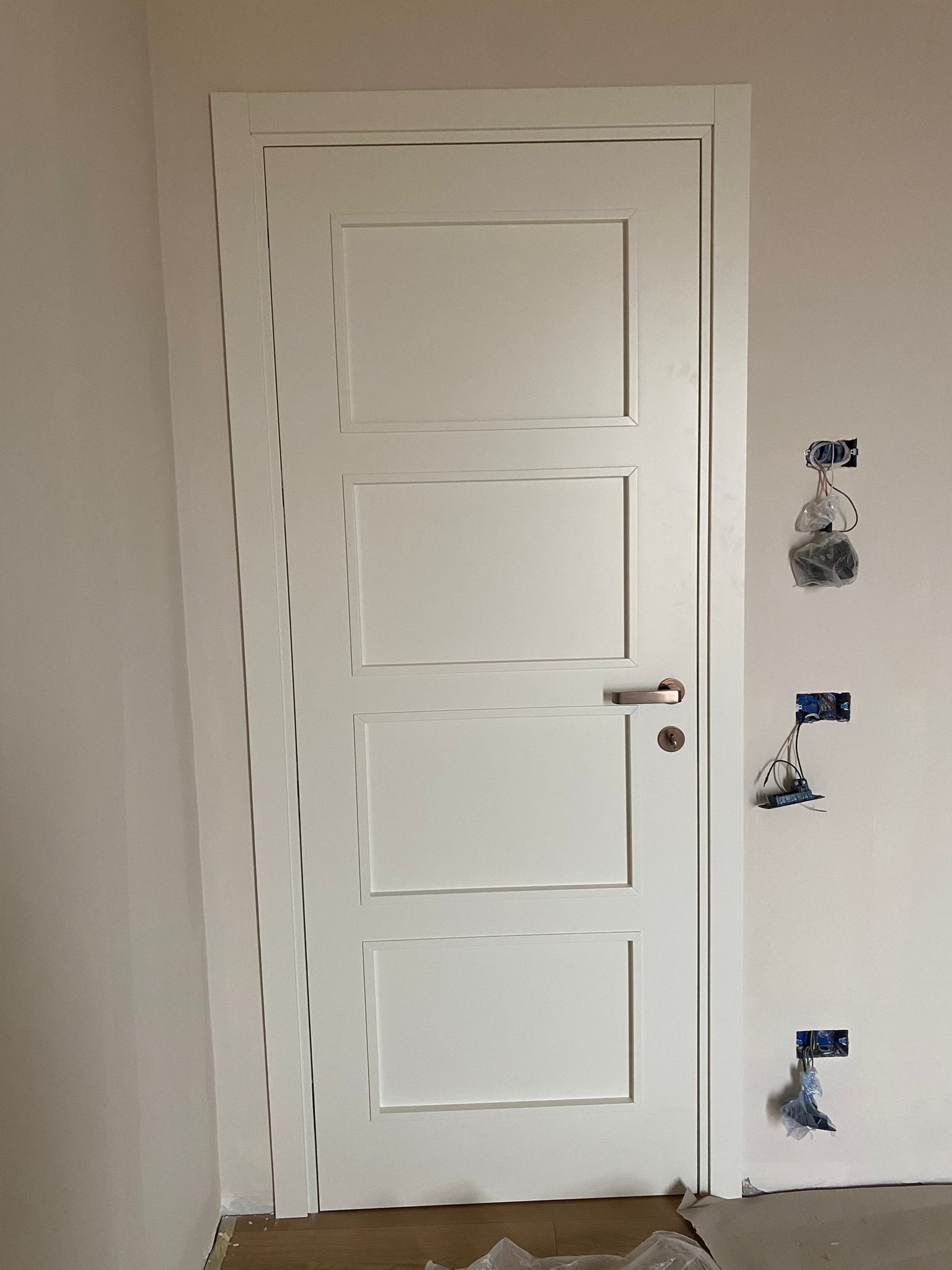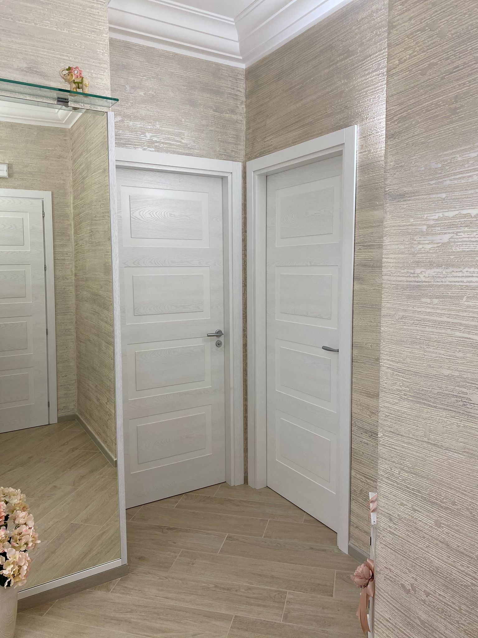- porte in legno massello con finitura moderna e maniglie in acciaio spazzolato;