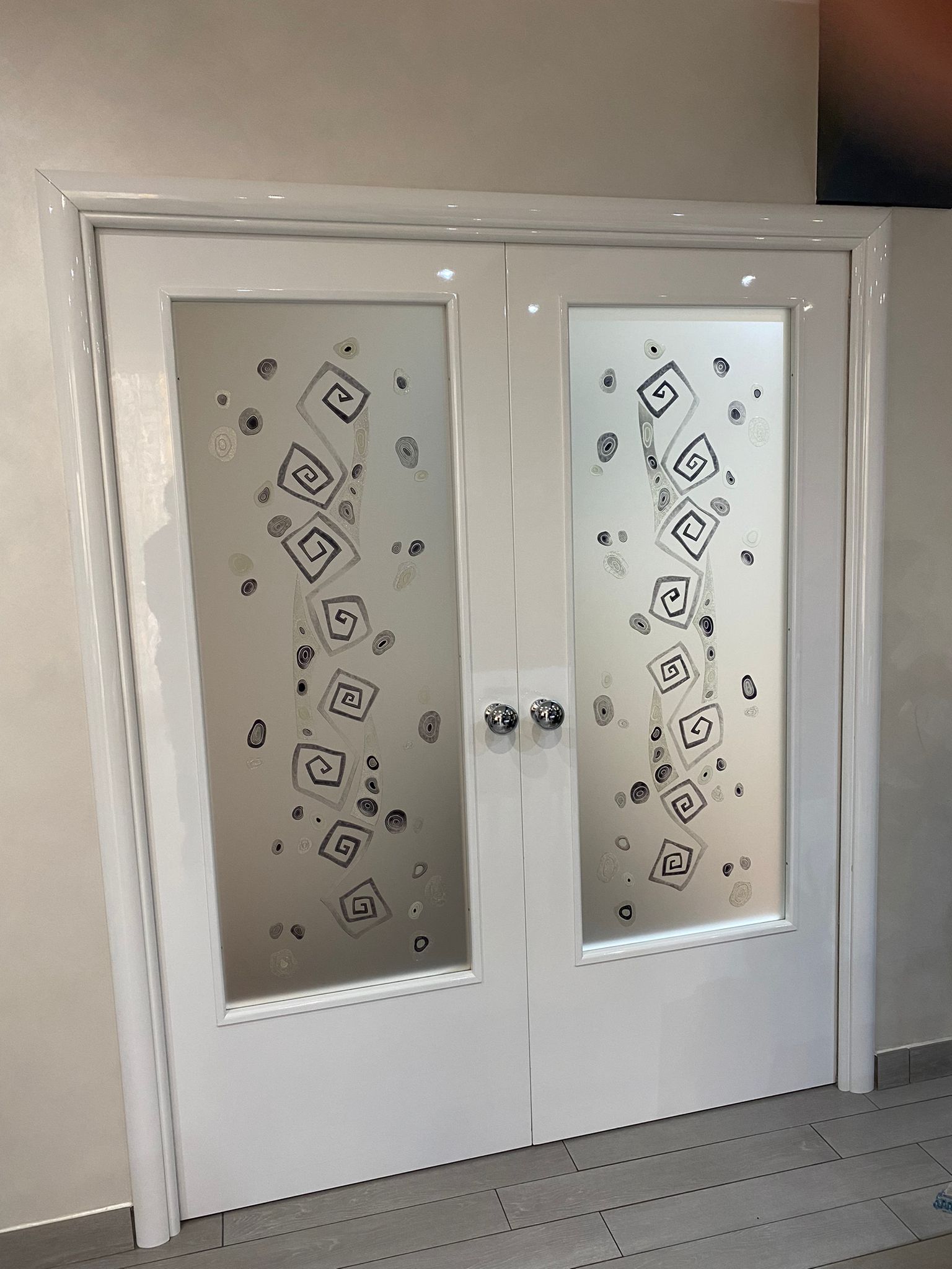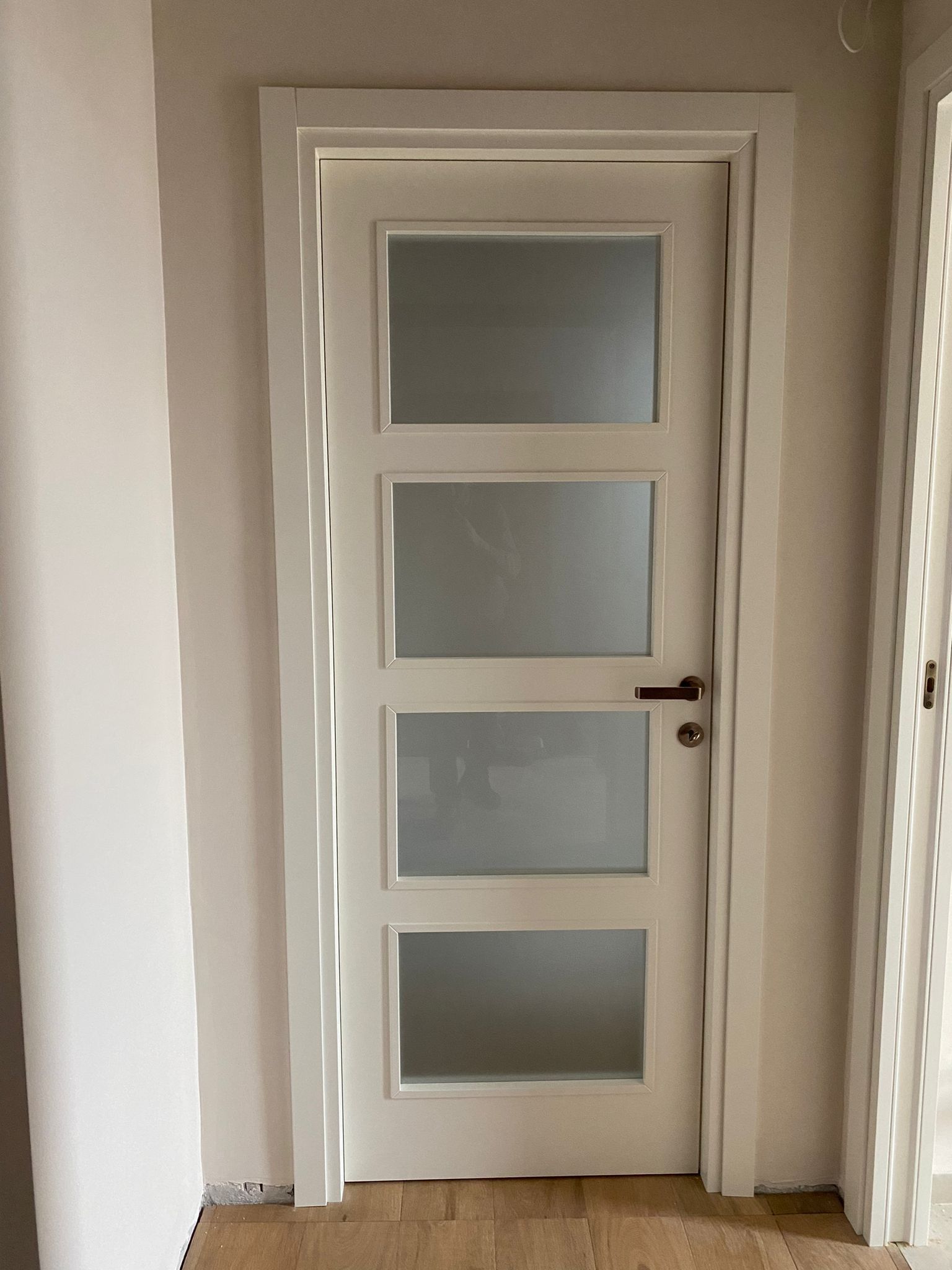 - porte divisorie interne in massello laccate bianche con vetrate artistiche satinate;