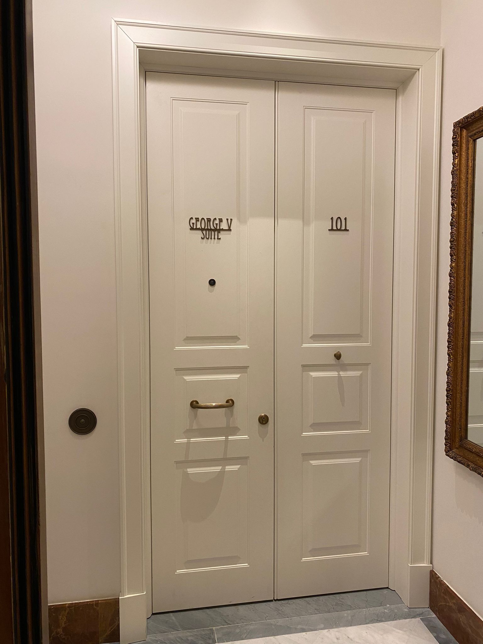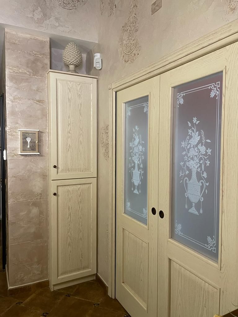 - porte interne su misura con maniglie dorate e vetrate artistiche colorate;