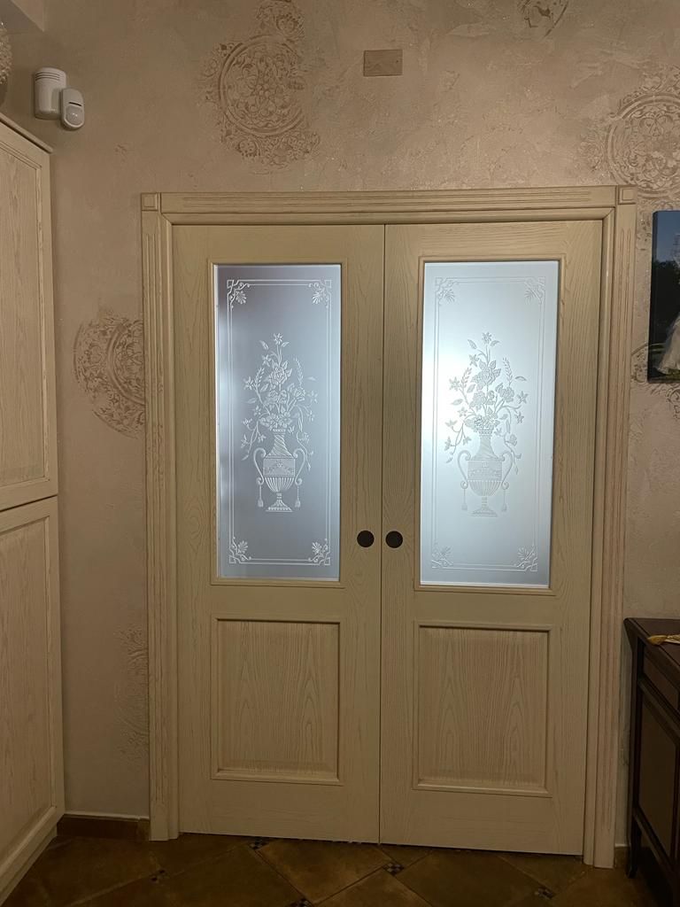 - porte classiche con decorazioni in rilievo su legno massello e applicazioni di vetrate artistiche artigianali su disegno del cliente.