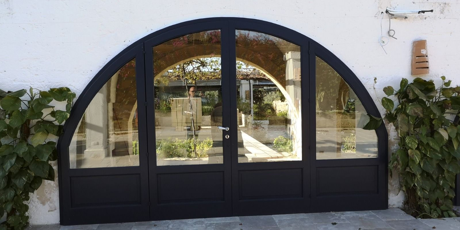 - porte esterne in massello su disegno del cliente con inserimento di griglia in ferro battuto e sportello spioncino;